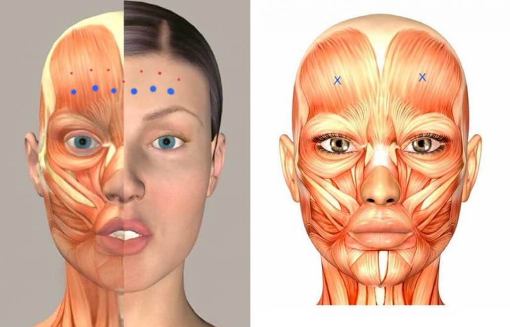 De anatomie achter de voorhoofdsrimpel bepaalt waar de injectie plaats zal vinden. De voorhoofdspier oftewel de musculus frontalis (X) is verantwoordelijk voor het optrekken van de wenkbrauwen waardoor er horizontale lijnen ontstaan. Door op de aangegeven plaatsen Botox te injecteren zullen de spieren ontspannen en de rimpels minder diep of geheel verdwijnen.